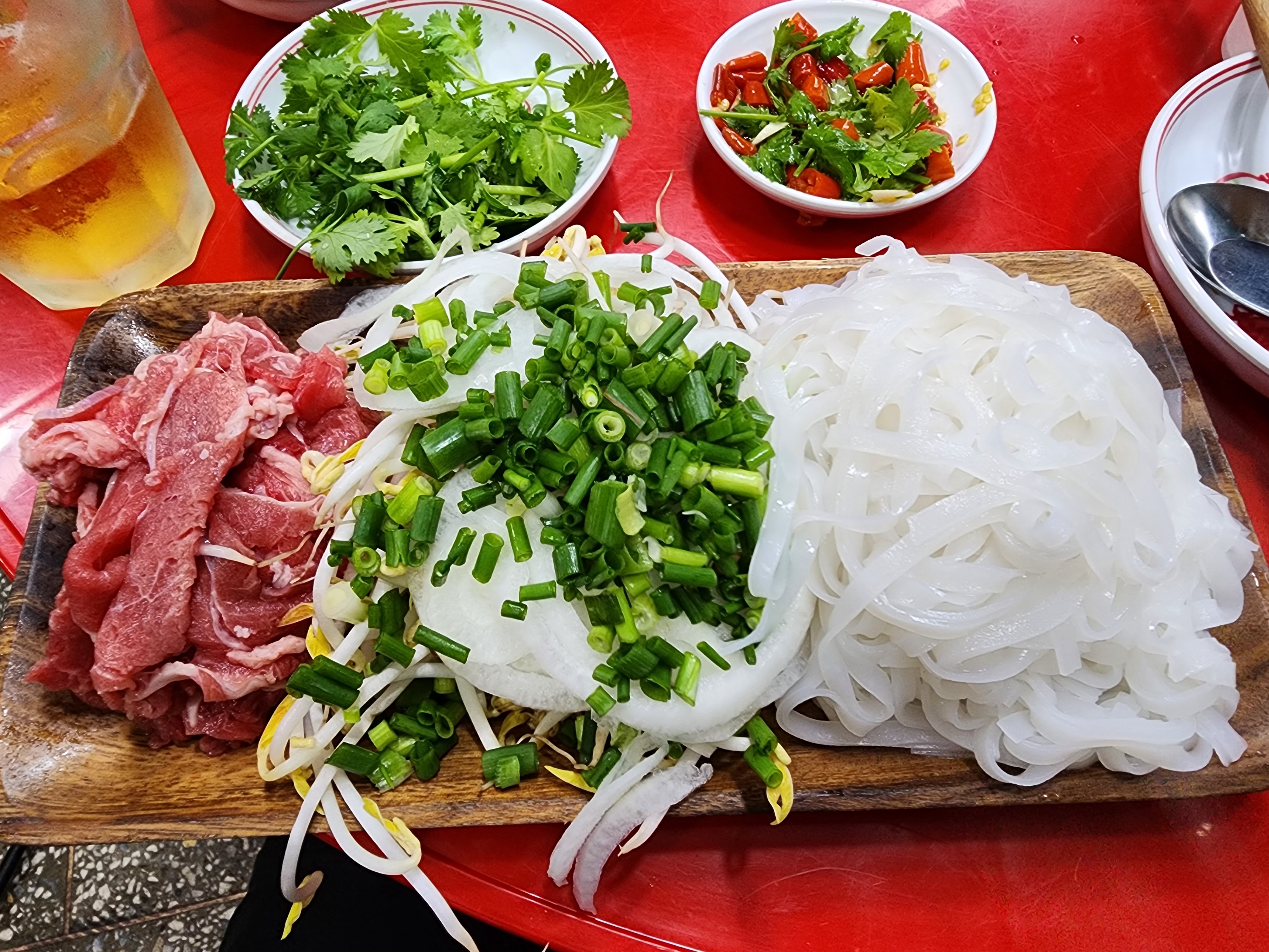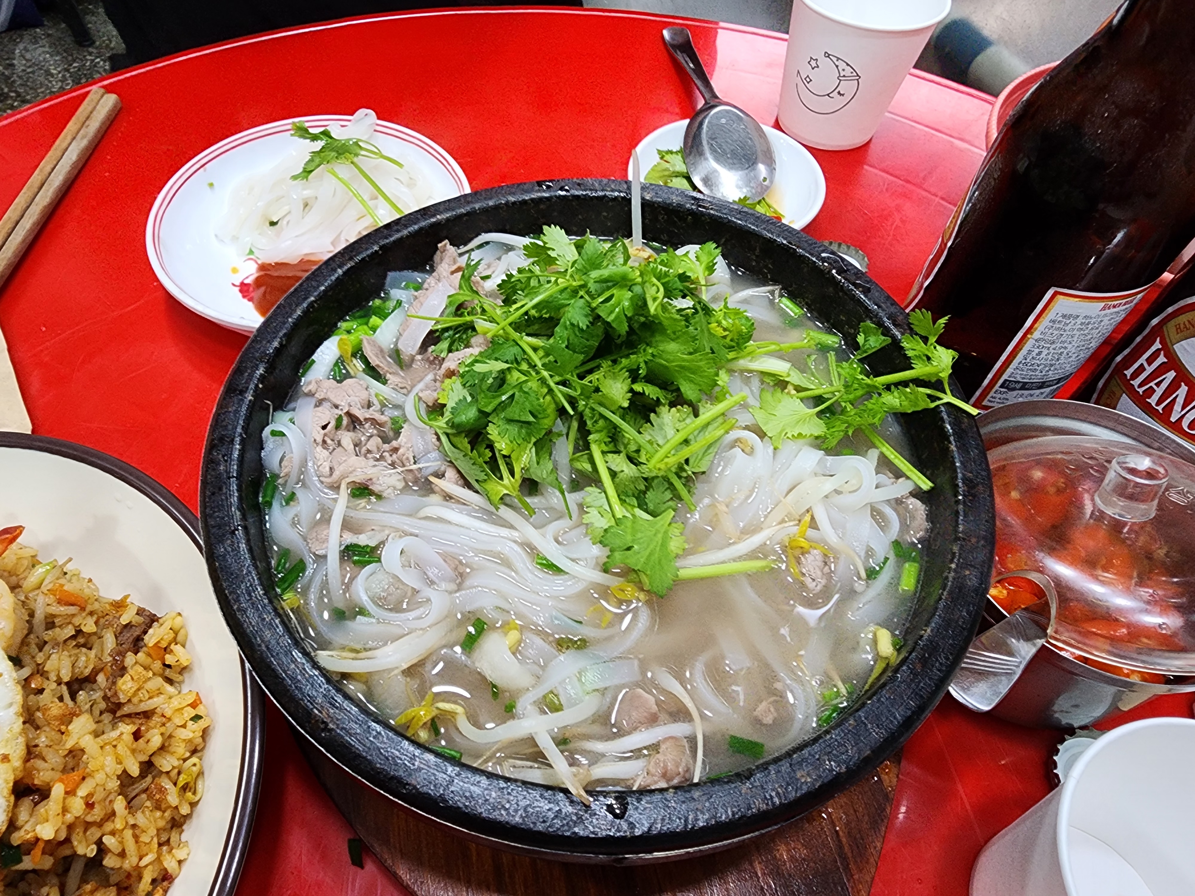 쌀국수는 샤브샤브식으로 나오는데 고기먼저 투입, 다음 야체 투입, 마지막 국수투입!