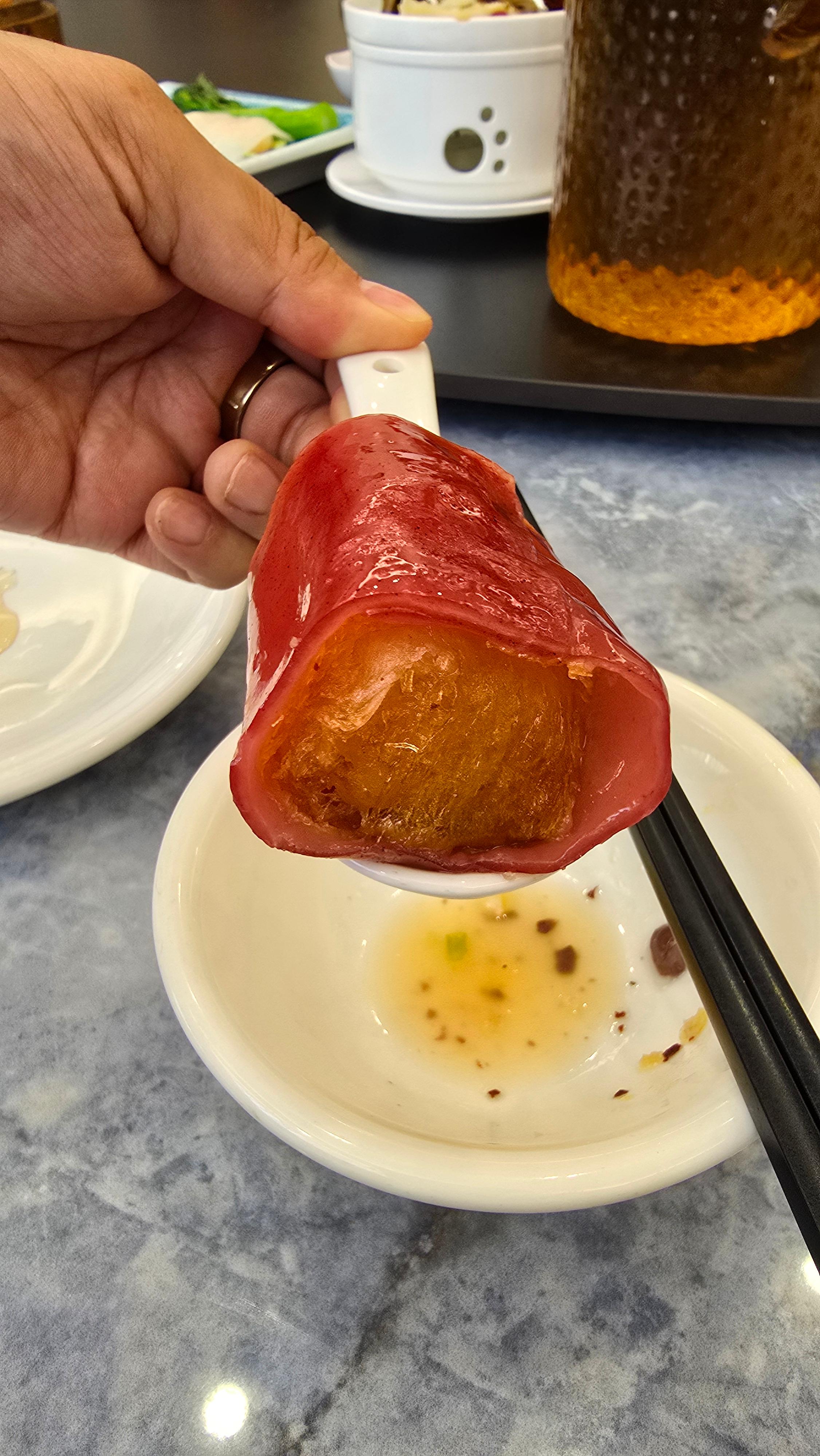 라창? 쌀가루로 얇고 촉촉하게 면처럼 만들고 속을 넣는 음식인데 이렇게 나오니 고급스럽네요.