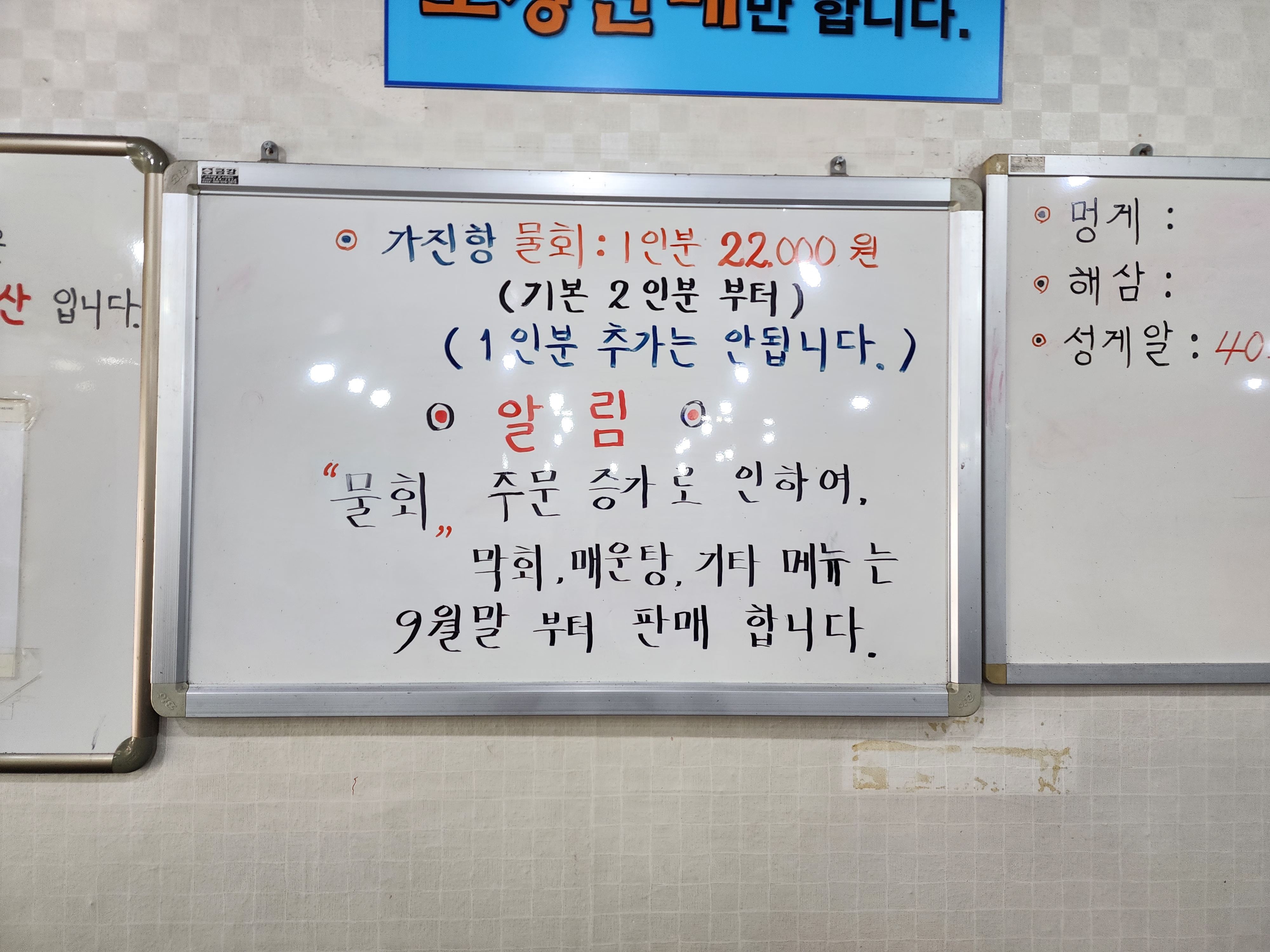 메뉴가 단촐합니다. 물회는 2인주문만 가능하고 추가도 2인 식이네요. 이집 문어 맛있다는데 인원이 적어 아직도 못먹어봤습니다.